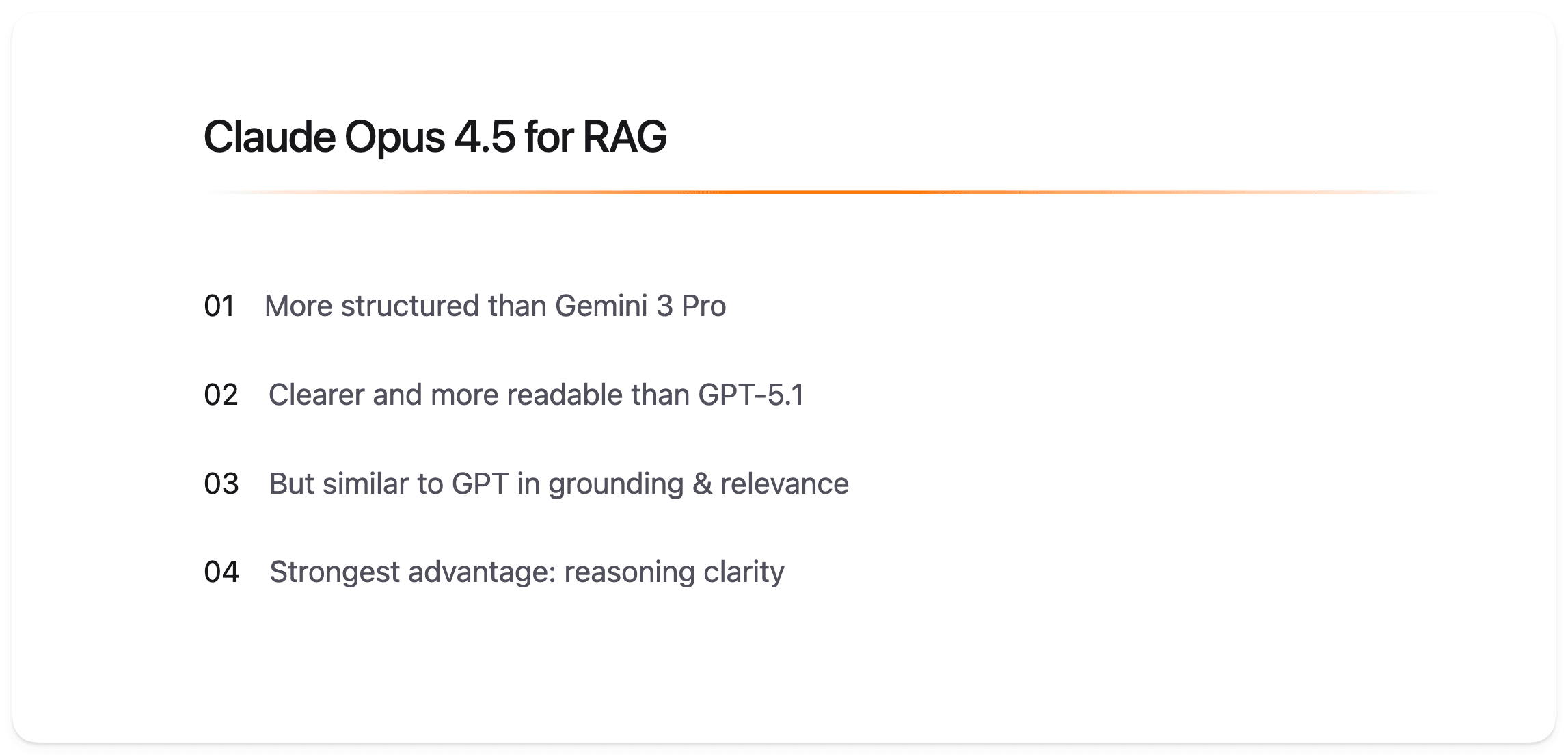 An evaluation of Opus 4.5 inside a real retrieval setup, compared against Gemini 3 Pro and GPT 5.1 across five behaviors that matter for RAG.