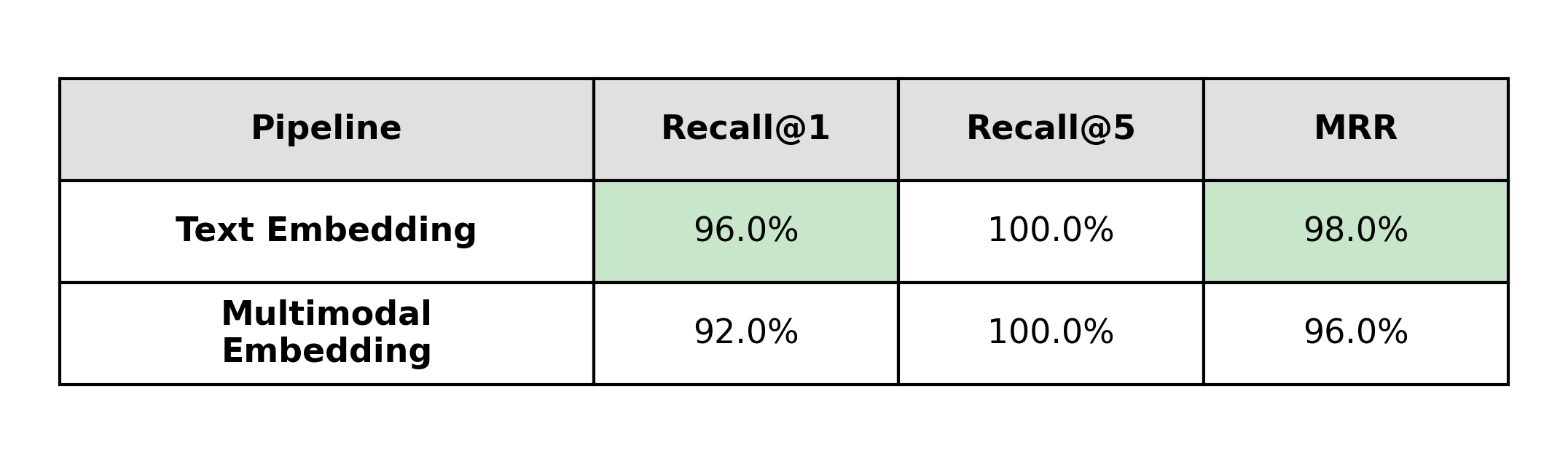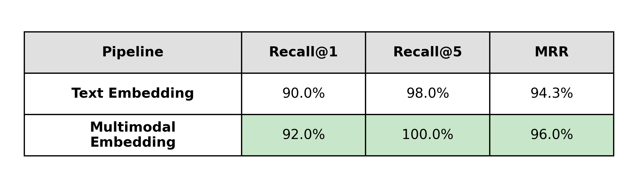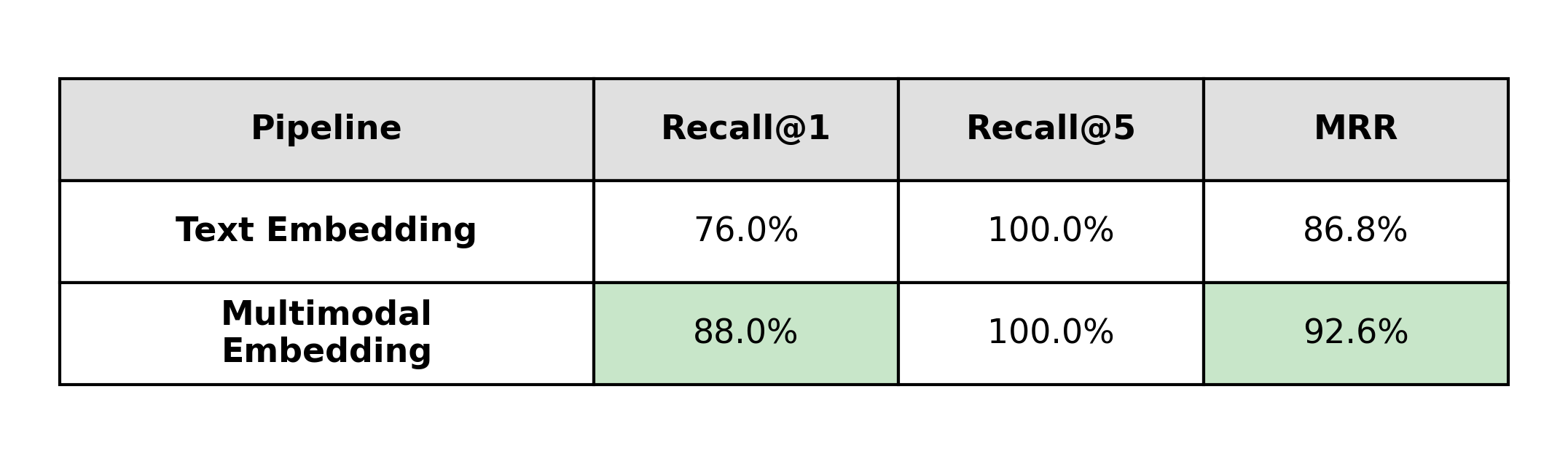 This shows up directly in the metrics: a 12-point Recall@1 difference in favor of multimodal embeddings.